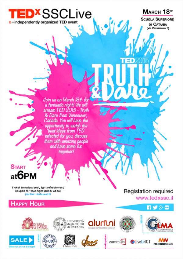 Mercoledì 18 marzo a partire dalle 18, nell'aula magna della Scuola Superiore di Catania (Villa San Saverio), verrà trasmesso in esclusiva, gratuitamente, lo streaming dei migliori talk della conferenza TED “Truth and dare” in programma il 17 marzo a Vancouver, in Canada.