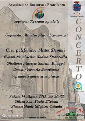 Sabato 14 marzo alle 20:30, alla Chiesa di San Nicolò l'Arena di Catania, l'associazione di volontariato Soccorso e Fratellanza organizza, in collaborazione con l'associazione Ekos Sicilia Ambiente Cultura, un concerto di beneficenza finalizzato alla raccolta fondi da destinare all'emergenza abitativa e all'acquisto di beni di prima necessità per famiglie indigenti catanesi segnalate dai servizi sociali.