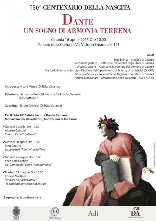 Giovedì 16 aprile alle 10, al Palazzo della Cultura, in via Vittorio Emanuele 121, si svolge l'incontro dal titolo "Dante. Un sogno di armonia terrena", promosso dal Comitato di Catania della Società Dante Alighieri in occasione del 750esimo anniversario della nascita di Dante.