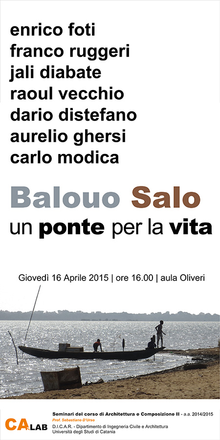 Organizzato nell'ambito dell'insegnamento di Architettura e Composizione Architettonica 2 del cld magistrale in Ingegneria edile/architettura (prof. Sebastiano D'Urso), l'incontro prevede la partecipazione del direttore del Dicar Enrico Foti, del console del Senegal Franco Ruggeri, dei progettisti Raoul Vecchio e Dario Distefano, promotori del progetto "Balouo Salo", il responsabile dei rapporti internazionali e interprete con la comunità locale Jali Diabate e i docenti Aurelio Ghersi, Carlo Modica e Sebastiano D'urso.