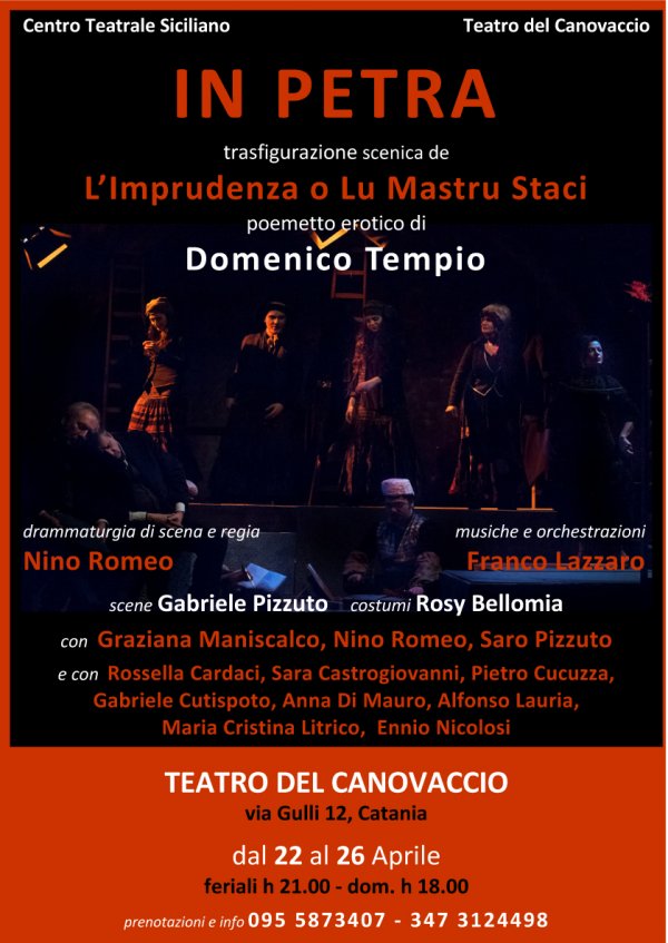 Da mercoledì 22 a domenica 26 aprile (ore 21 - domenica ore 18), al Teatro del Canovaccio di Catania, andrà in scena In Petra ovvero L’Imprudenza o Lu mastru Staci di Domenico Tempio, nell’allestimento di Nino Romeo.