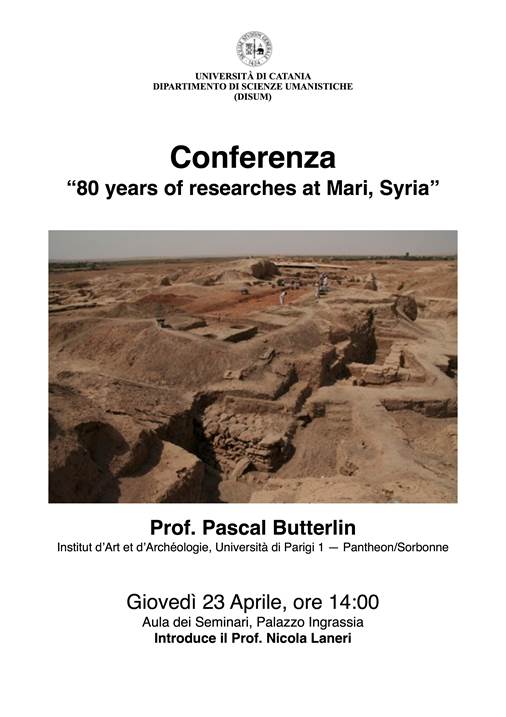 Si terrà giovedì 23 aprile alle 14, nell’aula dei seminari di Palazzo Ingrassia (via Biblioteca 4), sede della sezione di Archeologia del dipartimento di Scienze umanistiche, la conferenza del docente dell’Istituto d’arte e archeologia dell’Università di Parigi 1 – Pantheon/Sorbonne Pascal Butterlin, sul tema “80 anni di ricerca a Mari in Siria”.