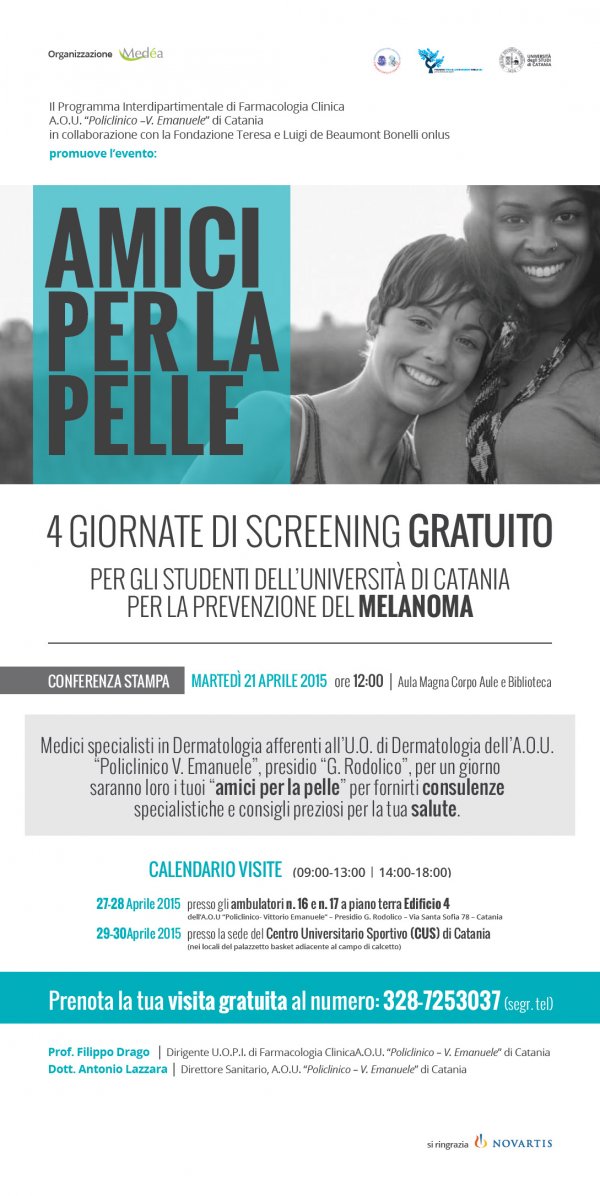 Dal 27 al 30 aprile, al Policlinico e al Cus Catania, gli studenti universitari potranno usufruire di screening gratuiti per la prevenzione del melanoma. L'iniziativa, che si chiama Amici per la pelle, è del Programma interdipartimentale di Farmacologia clinica dell’Azienda Ospedaliero Universitaria “Policlinico –Vittorio Emanuele” di Catania, in collaborazione con la Fondazione "Teresa e Luigi de Beaumont Bonelli Onlus".