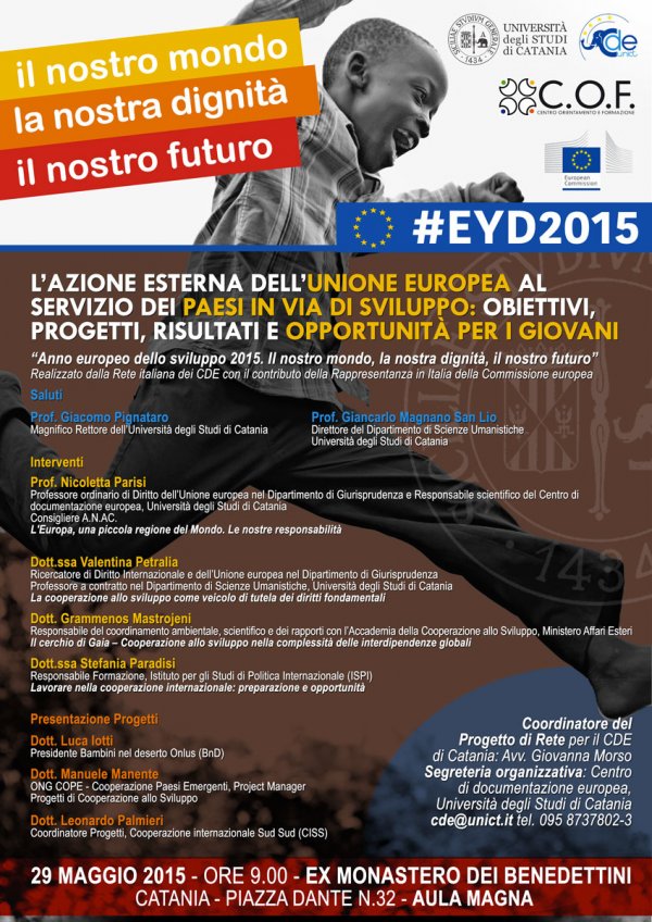 Venerdì 29 maggio alle 9, nell'aula magna del Monastero dei Benedettini, si tiene la conferenza dal titolo "L’azione esterna dell’Unione Europea al servizio dei Paesi in via di sviluppo: obiettivi, progetti, risultati e opportunità per i giovani" organizzata dal Centro di documentazione europea dell’Università di Catania, in collaborazione con il Centro orientamento e formazione.