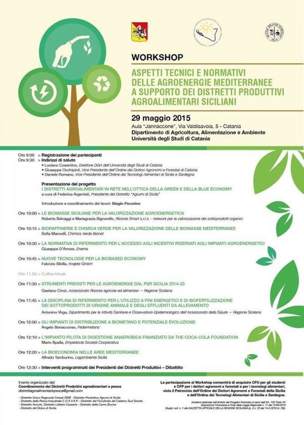 Venerdì 29 maggio alle 9:30, nell'aula "Jannaccone" del dipartimento Agricoltura, Alimentazione e Ambiente (via Valdisavoia 5), si svolge il workshop "Aspetti tecnici e normativi delle agroenergie mediterranee a supporto dei distretti produttivi agroalimentari siciliani" promosso dal Coordinamento dei Distretti produttivi agroalimentari e pesca.