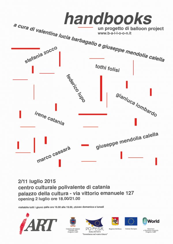 Giovedì 2 luglio alle 18, al Centro Culturale Polivalente - Palazzo della Cultura di Catania, si terrà Handbooks, una presentazione di libri realizzati da artisti siciliani, a cura di Valentina Lucia Barbagallo e Giuseppe Mendolia Calella