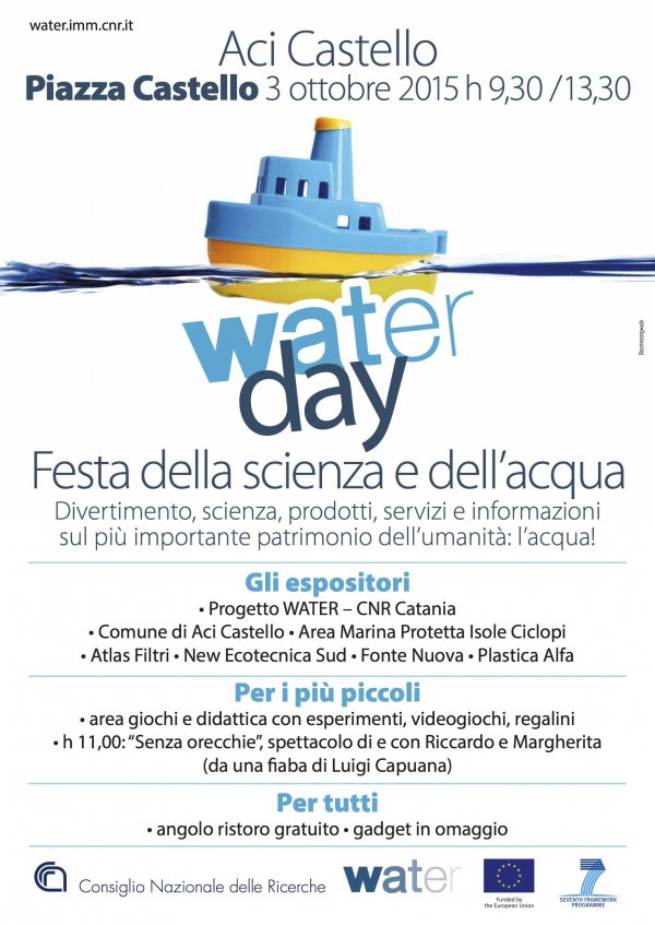 Sabato 3 ottobre, a partire dalle 9:30, in piazza Castello ad Aci Castello, l'Istituto per la microelettronica e i microsistemi (Imm-Cnr) - Uos di Catania (Università) organizza il Water Day. Si tratta di un evento per festeggiare la scienza e l’acqua a conclusione del progetto europeo FP7 Water.