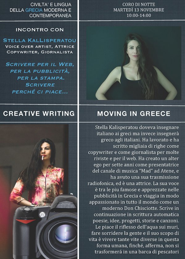 Venerdì 13 novembre alle 10, nel coro di notte del Monastero dei Benedettini, si tiene l'incontro con l'attrice e giornalista Stella Kallisperatou dal titolo "Scrivere per il web, per la pubblicità, per la stampa. Scrivere perché ci piace...".