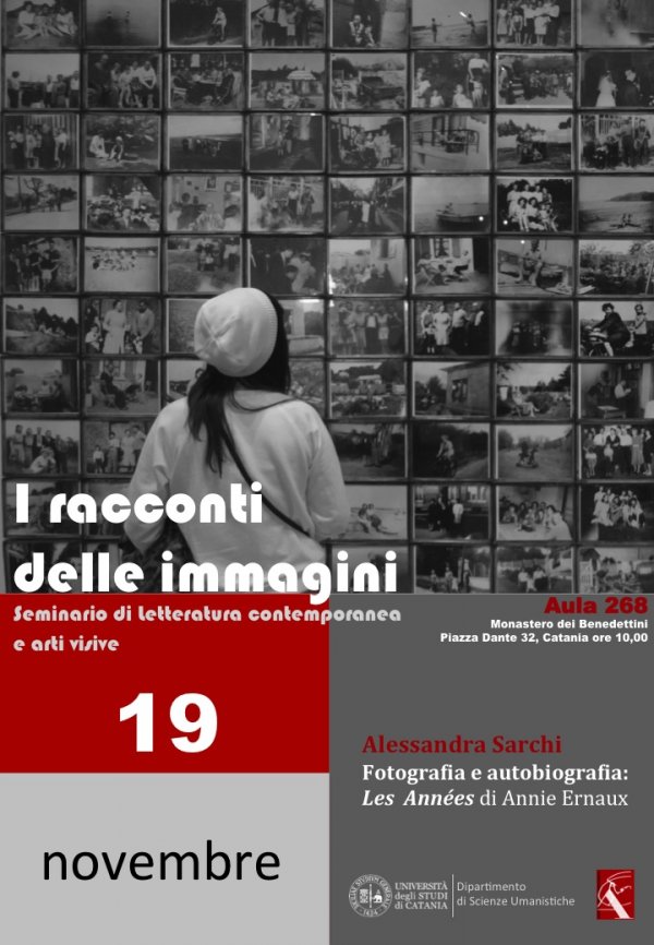 Giovedì 19 novembre alle 10, nell’aula 268 del Monastero dei Benedettini, la scrittrice Alessandra Sarchi terrà un seminario dal titolo “Fotografia autobiografia: Les Années di Annie Ernaux”, nell’ambito del ciclo “I racconti delle immagini. Seminario di letteratura contemporanea e arti visive” del dipartimento di Scienze umanistiche dell’Università di Catania (prof.ssa Maria Rizzarelli).