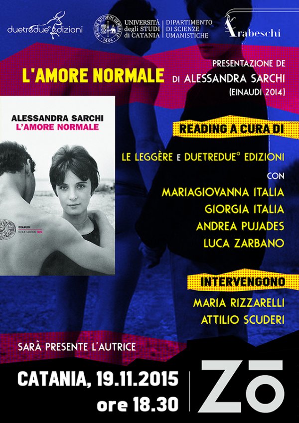 Nel pomeriggio, alle 18:30, nella sede del Centro Culture Contemporanee Zo, si terrà un reading di presentazione del suo romanzo "L'amore normale” (Einaudi, 2014), a cura di Duetredue edizioni e Le Leggére. Interverranno, insieme all'autrice, i docenti di letteratura italiana del Disum Maria Rizzarelli e Attilio Scuderi. Letture di Maria Giovanna Italia, Giorgia Italia, Andrea Pujades, Luca Zarbano.