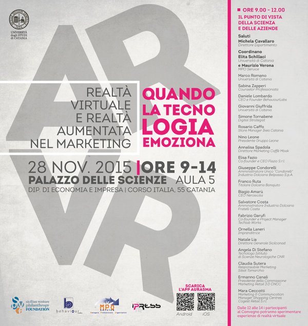 Sabato 28 novembre alle 9, nell'aula 5 di Palazzo delle Scienze, si svolge il convegno "Realtà virtuale e realtà aumentata nel marketing. Quando la tecnologia emoziona" organizzato dal dipartimento di Economia e Impresa con il coordinamento scientifico della prof.ssa Elita Schillaci.