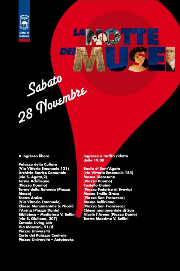 Sabato 28 novembre (ore 19-1:00), l’assessorato alla cultura del Comune di Catania aderisce alla Notte dei Musei, giornata in cui i musei civici e siti monumentali della città saranno aperti al pubblico a ingresso libero o ridotto.