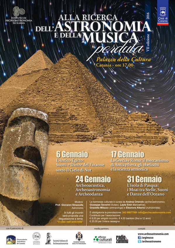 Prende il via mercoledì 6 gennaio, al Palazzo della Cultura di Catania, la rassegna di astronomia e musica antica "Alla ricerca dell’astronomia e della musica perduta" organizzata dall'Istituto di Archeoastronomia Siciliana. Il primo dei quattro appuntamenti in programma è con l'evento dal titolo "L’antico Egitto: suoni e danze del faraone sotto il cielo di Nut" (ore 17).