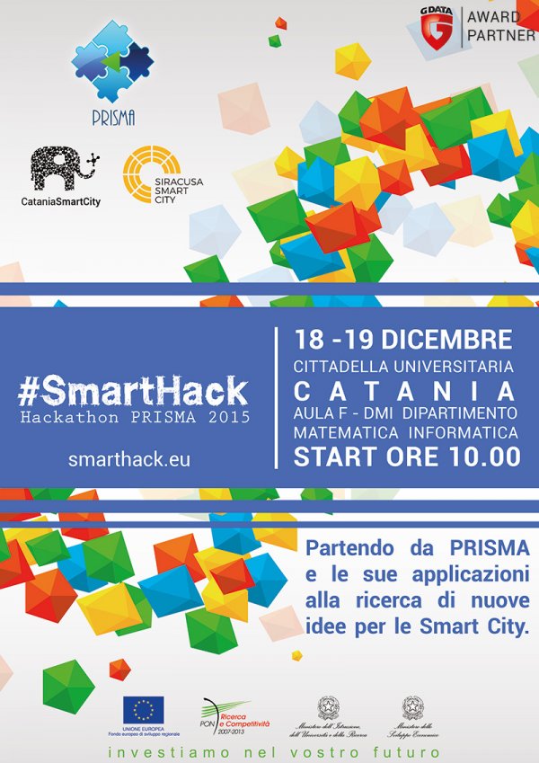 Venerdì 18 e sabato 19 dicembre, a partire dalle 10, si svolge al dipartimento di Matematica e Informatica (aula F, Cittadella Universitaria) #SmartHack 2015, l'hackathon della piattaforma urbana Prisma. Si tratta di due giorni di contaminazione e scambio di idee per creare nuove applicazioni che rendano Catania più smart.
