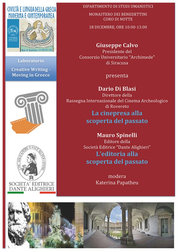 Venerdì 18 dicembre alle 10, nel Coro di notte del Monastero dei Benedettini, Dario di Blasi (direttore della Rassegna internazionale del cinema archeologico di Rovereto) e Mauro Spinelli (Società editrice "Dante Alighieri") intervengono alla conferenza sul tema "La cinepresa e l'editoria alla scoperta del passato" che sarà introdotta dal presidente del Consorzio universitario "Archimede" di Siracusa.