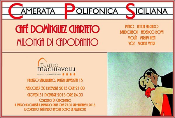 Mercoledì 30 (ore 21) e giovedì 31 dicembre (ore 24), al Teatro Machiavelli di Catania, il Café Domìnguez Cuarteto si esibirà nel concerto Milonga di Capodanno, organizzato in collaborazione con la Camerata Polifonica Siciliana.