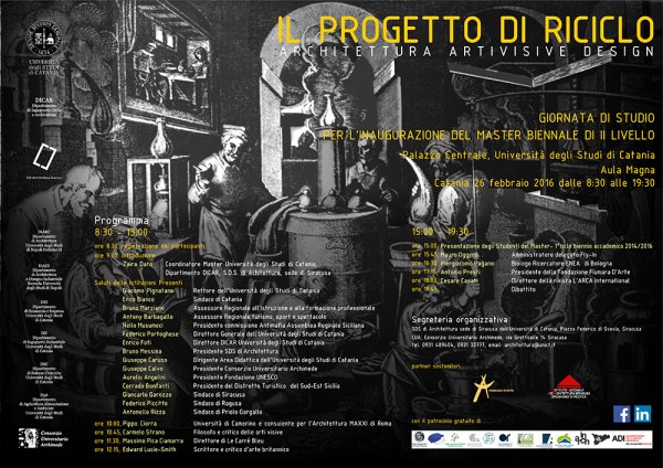 Venerdì 26 febbraio alle 9:30, nell'aula magna del Palazzo Centrale dell'Università di Catania, si svolge una giornata di studio organizzata a conclusione del primo anno di attività del master biennale "Il Progetto di riciclo: architettura, arti visive, design", di cui è coordinatore la prof.ssa Zaira Dato della Struttura didattica speciale di Architettura di Siracusa.