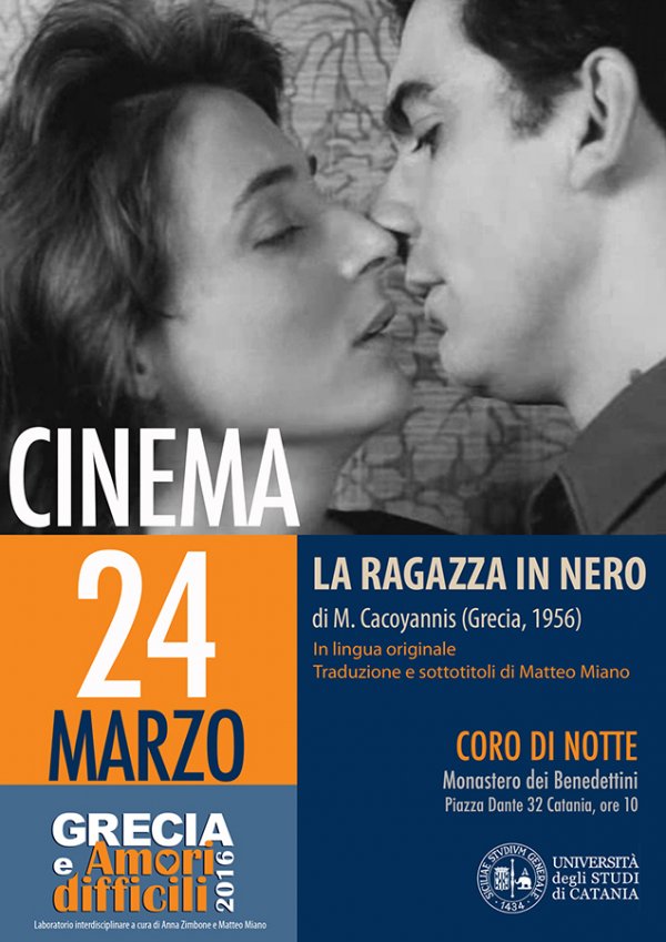 L'appuntamento, a ingresso libero, prevede la proiezione del film "La ragazza in nero" di Michael Cacoyannis (1956, durata 110’’) in lingua originale (traduzione e sottotitoli di Matteo Miano).