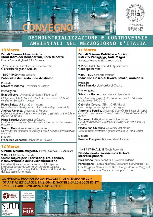 In programma, due tavole rotonde: una a Catania, con gli studiosi, sugli apporti che i diversi saperi disciplinari possono dare alla comprensione del fenomeno; l'altra ad Augusta, con i protagonisti sociali, sulle prospettive dell'area industriale petrolchimica megarese. Saranno al centro del convegno i temi della crisi strutturale degli insediamenti industriali meridionali a fronte dei processi di globalizzazione, della disoccupazione e trasformazione dei profili sociali e culturali degli abitanti dei luoghi, delle ricadute ambientali in termini di inquinamento e bonifica dei siti, dei processi di riqualificazione, riconversione e risignificazione dei territori in via di deindustrializzazione.