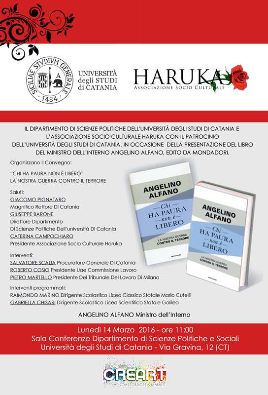 Lunedì 14 marzo alle 11, nell'aula magna di Palazzo Pedagaggi (via Vittorio Emanuele II, 49), il ministro dell'Interno Angelino Alfano presenterà il suo libro "Chi ha paura non è libero" (Mondadori, 2015). L'incontro è promosso dal dipartimento di Scienze politiche e sociali e dall'associazione socioculturale Haruka.