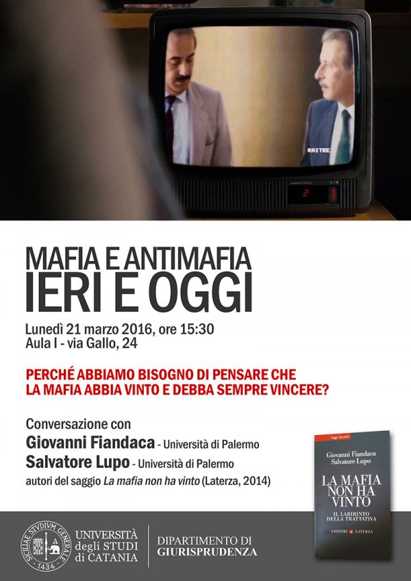 L'incontro - una conversazione con i docenti dell'Università di Palermo Giovanni Fiandaca e Salvatore Lupo, autori del saggio La mafia non ha vinto (Laterza, 2014) - è organizzato dal dipartimento di Giurisprudenza.