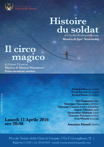 Lunedì 11 aprile alle 20:30, al Piccolo Teatro della Città di Catania, andrà in scena Histoire du soldat di Charles-Ferdinand Ramuz e Il circo magico di Gianni Clementi, all'interno del cartellone della Società Catanese Amici della Musica.