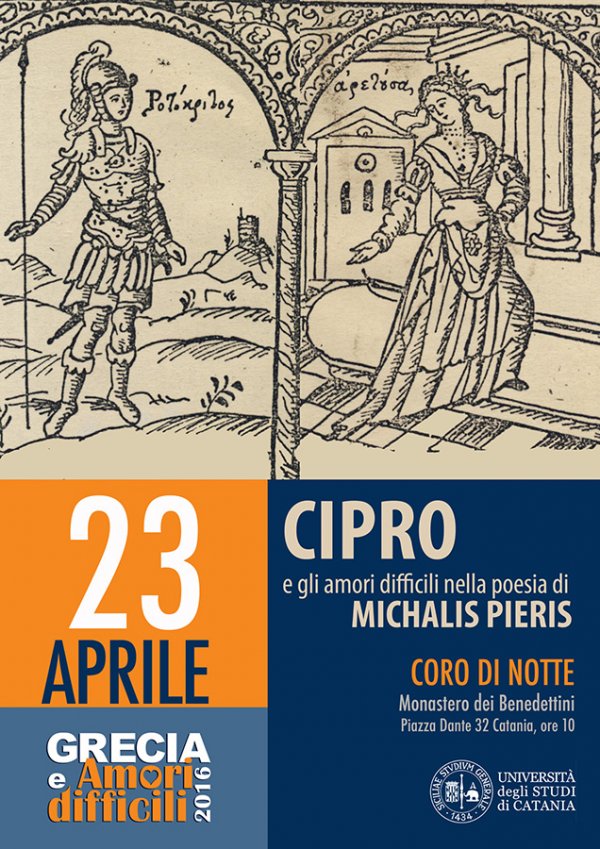 Sabato 23 aprile alle 10, nel Coro di notte del Monastero dei Benedettini, si svolge il seminario "Cipro e gli amori difficili nella poesia di Michalis Pierìs", quinto appuntamento del ciclo di laboratori interdisciplinari di civiltà greca moderna "La Grecia e gli amori difficili".