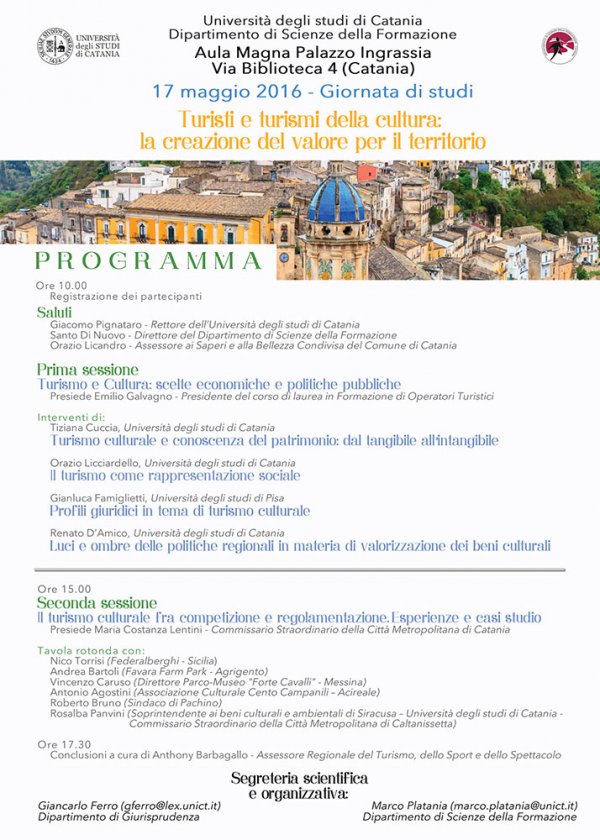 Il convegno, organizzato nell'ambito delle attività formative rivolte agli studenti del corso di laurea in Formazione di Operatori turistici, intende offrire una riflessione interdisciplinare sul tema, attraverso il confronto tra studiosi e operatori del settore, anche al fine di individuare nuove strategie di potenziamento dell’offerta turistica culturale sul territorio siciliano.