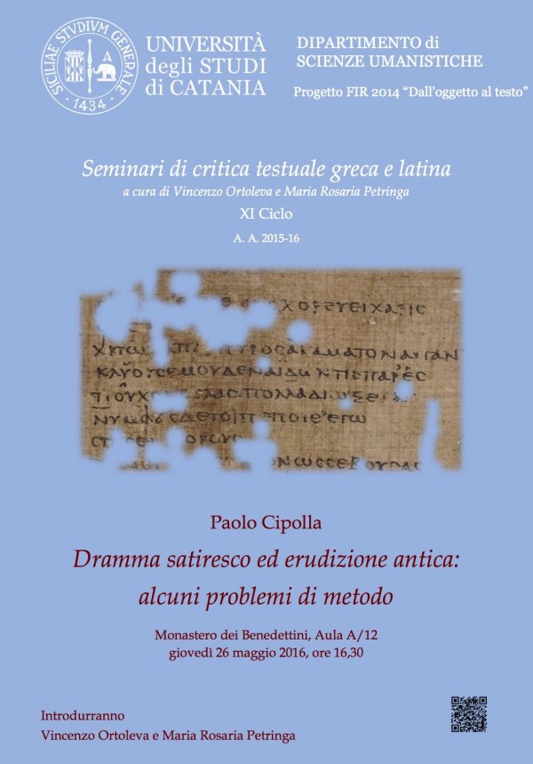 Giovedì 26 maggio alle 16:30, nell’aula A12 del Monastero dei Benedettini, il prof. Paolo Cipolla (Lingua e Letteratura greca) terrà il terzo seminario del ciclo 2015/16 dei "Seminari di critica testuale greca e latina" dal titolo "Dramma satiresco ed erudizione antica: alcuni problemi di metodo".