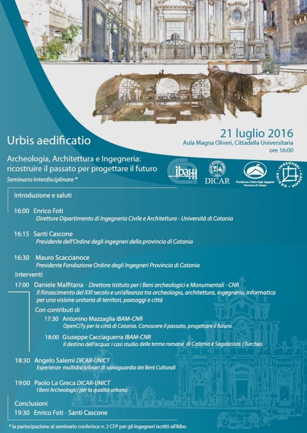 Giovedì 21 luglio alle 16, nell'aula magna "Oliveri" della Cittadella universitaria (Edificio 4, dipartimento di Ingegneria Civile e Architettura), si terrà il seminario "Urbis aedificatio - Archeologia, Architettura e Ingegneria: ricostruire il passato per progettare il futuro".