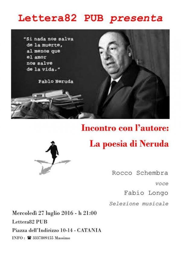 Mercoledì 27 luglio alle 21, al Lettera 82 Pub di Catania, per la rassegna “Incontro con l’autore", si terrà l'incontro letterario La poesia di Neruda.