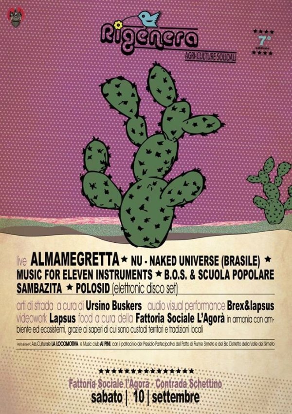 Sabato 10 settembre, all'Agorà Fattoria Sociale (Contrada Schettino, Santa Maria di Licodia, Catania), l’associazione culturale La Locomotiva presenta la settima edizione del festival "Rigenera. Agri-culture Solidali".