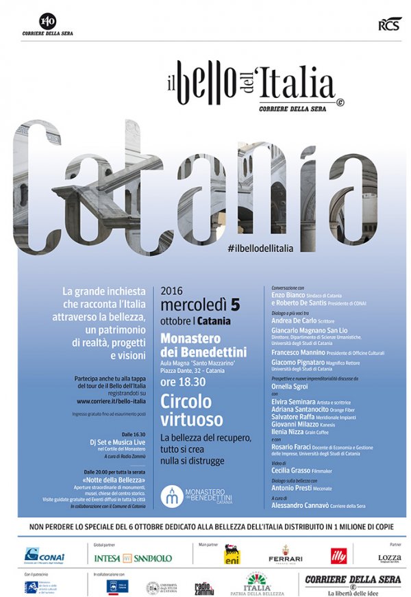 - Circolo virtuoso: Mercoledì 5 ottobre fa tappa a Catania il progetto del Corriere della Sera "Il Bello dell’Italia". La giornata conclusiva si terrà al Monastero dei Benedettini. Dalle 20 in avanti, "Notte della Bellezza" (05 ottobre 2016)