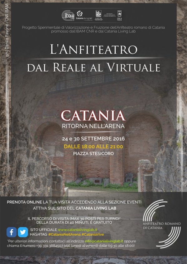 Venerdì 30 settembre, dalle 18 alle 21, proseguono i percorsi di visita "L’anfiteatro dal reale al virtuale" organizzati dagli esperti dell’Ibam Cnr e dal team del Catania Living Lab all'Anfiteatro romano di piazza Stesicoro a Catania.