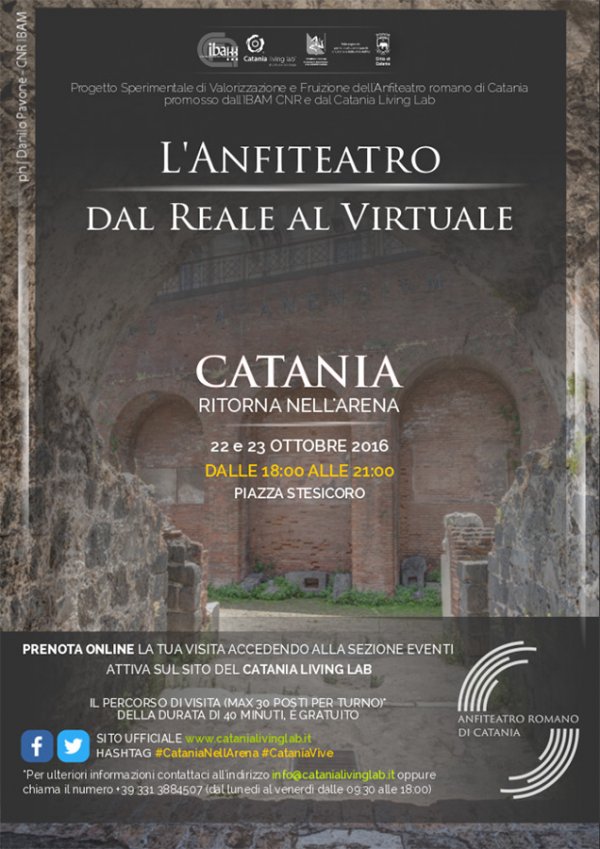 Sabato 22 e domenica 23 ottobre, dalle 18 alle 21, tornano i percorsi di visita "L’anfiteatro dal reale al virtuale" organizzati dagli esperti dell’Ibam Cnr e dal team del Catania Living Lab all'Anfiteatro romano di piazza Stesicoro a Catania.
