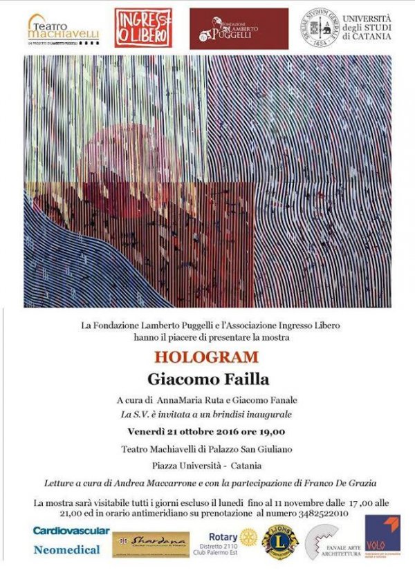 Venerdì 21 ottobre alle 19, al Teatro Machiavelli di Catania, la Fondazione Lamberto Puggelli e l’associazione Ingresso Libero presentano la mostra "Hologram" di Giacomo Failla.