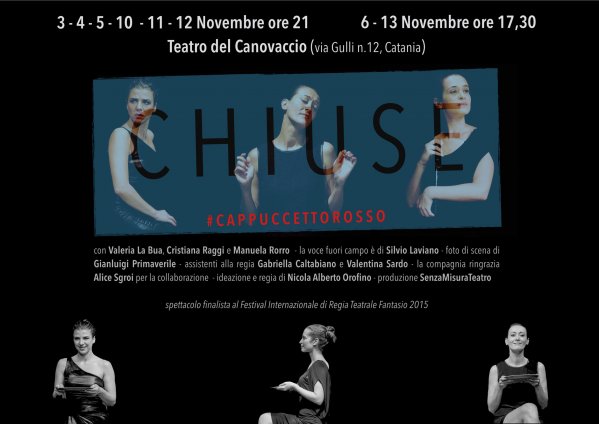 Dal 3 al 6 novembre, al Teatro del Canovaccio (via Gulli 12, Catania), va in scena "Chiuse - #CappuccettoRosso", il primo spettacolo in cartellone per la stagione 2016/17 con la direzione artistica di Saro Pizzuto e Salvo Musumeci (direzione tecnica di Simone Raimondo e Gabriele Pizzuto).