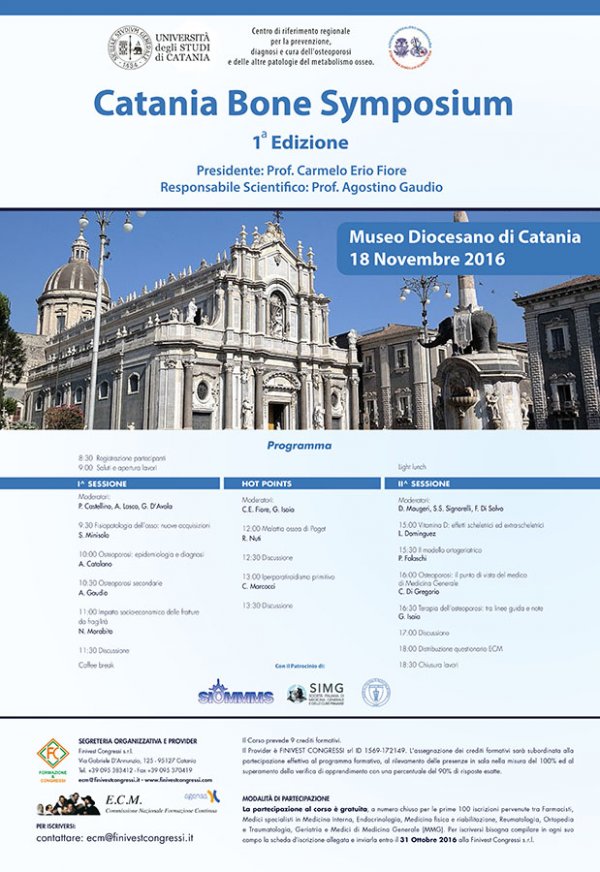 Il convegno ha ricevuto il patrocinio dell’Università di Catania, dell’AOU “Policlinico-Vittorio Emanuele”, della Società Italiana dell’Osteoporosi, del Metabolismo Minerale e delle Malattie dello Scheletro, della Società Italiana di Medicina Interna e della Società Italiana di Medicina Generale e delle Cure Primarie.