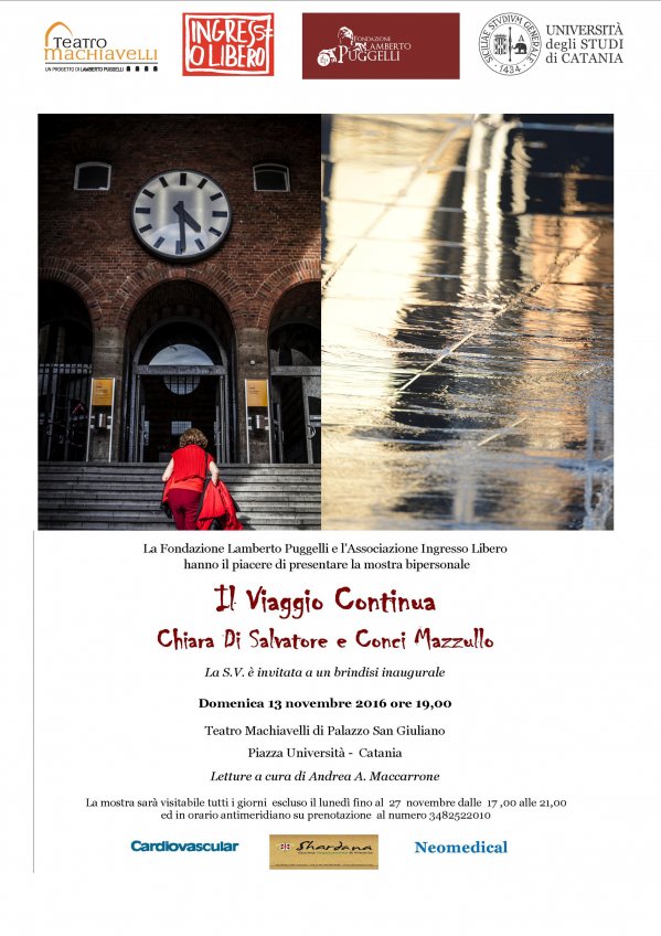 Domenica 13 novembre alle 19, al Teatro Machiavelli di Catania, si terrà il vernissage della mostra delle fotografe Chiara Di Salvatore e Conci Mazzullo, dal titolo "Il viaggio continua", a cura dell'associazione Ingresso Libero e della Fondazione Lamberto Puggelli.