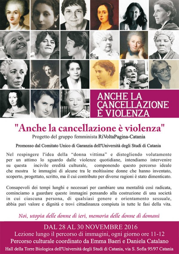 Da lunedì 28 a mercoledì 30 novembre, nella hall della Torre Biologica (via Santa Sofia 95/97, Catania), sarà allestito il percorso “Anche la cancellazione è violenza”, ideato dal gruppo femminista RiVoltaPagina in occasione della “Giornata internazionale per l'eliminazione della violenza contro le donne” (25 novembre) e promosso dal Comitato Unico di Garanzia dell'Università di Catania. Ogni giorno, dalle 11 alle 12, sarà possibile inoltre partecipare a una lezione itinerante lungo il percorso di immagini curato da Emma Baeri e Daniela Catalano.