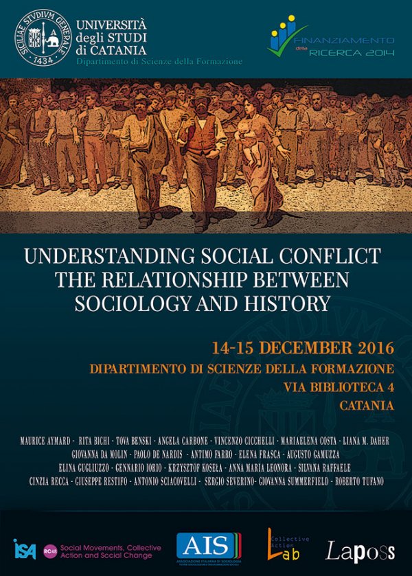 Mercoledì 14 e giovedì 15 dicembre, nell'aula 1 di Palazzo Ingrassia (dipartimento di Scienze della Formazione) si tiene il convegno internazionale dal titolo "Understanding Social Conflict. The Relationship between Sociology and History” che affronta il tema del conflitto sociale e dell’ambivalenza come terreno di ricerca comune per Sociologia e Storia.