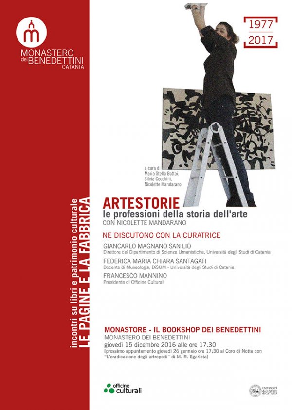 Giovedì 15 dicembre alle 17:30, al Monastore (il bookshop del Monastero dei Benedettini), si tiene il primo degli appuntamenti del calendario “Le pagine e la fabbrica - Incontri su libri e patrimonio culturale” al quale partecipano Nicolette Mandarano, curatrice insieme a Maria Stella Bottai e a Silvia Cecchini del libro “Artestorie: le professioni della storia dell’arte”.