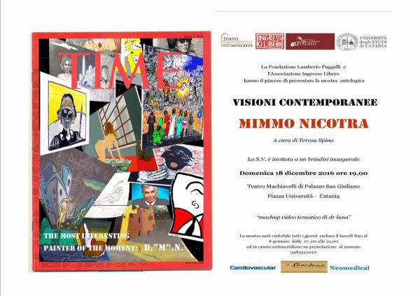 Dal 18 dicembre all'8 gennaio, al Teatro Machiavelli di Catania, l'Associazione Ingresso Libero e la Fondazione Lamberto Puggelli presentano la mostra antologica di Mimmo Nicotra, Visioni contemporanee, a cura di Teresa Spina.