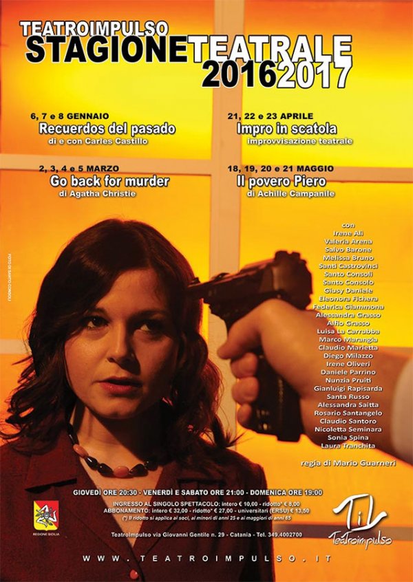 - Go back for murder: Dal 2 al 5 marzo, al Teatroimpulso di Catania, va in scena il testo di Agatha Christie (regia di Mario Guarneri), per la stagione teatrale 2016/17