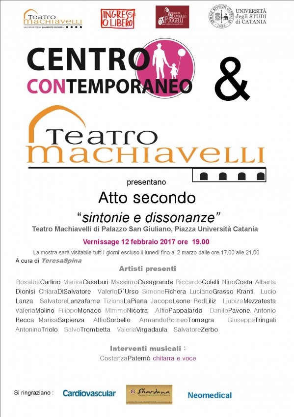 Domenica 12 febbraio alle 19, al Teatro Machiavelli a Catania, sarà inaugurato la mostra collettiva "Sintonie e dissonanze - Atto secondo", a cura di Teresa Spina.