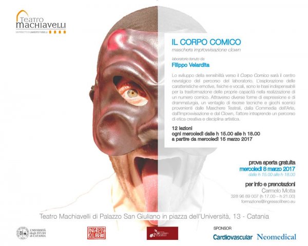 Mercoledì 8 marzo, dalle 15 alle 18, al Teatro Machiavelli, si svolge la prova aperta gratuita del laboratorio tenuto da Filippo Velardita "Il corpo comico - maschera improvvisazione clown" che prenderà il via mercoledì 15 marzo 2017.