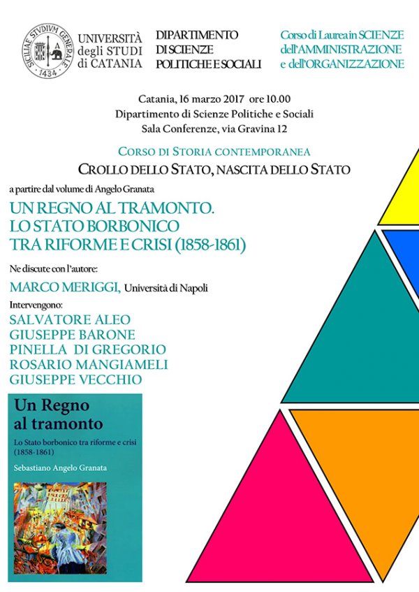 Giovedì 16 marzo alle 10, nella Sala conferenze del Polo didattico "Gravina" (dipartimento di Scienze politiche e sociali, via Gravina 12, Catania), si terrà il seminario dal titolo “Crollo dello Stato, nascita dello Stato”, a partire dal volume di Angelo Granata "Un Regno al tramonto. Lo Stato borbonico tra riforme e crisi (1858-1861)", edito da Carocci.