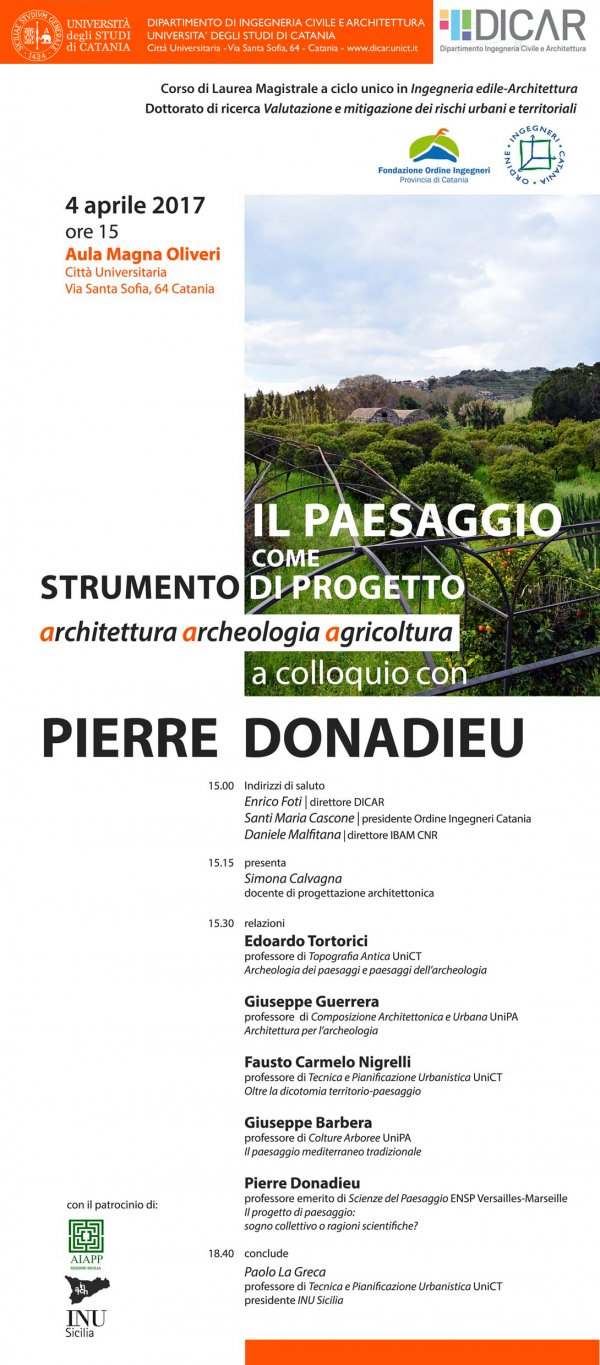 Martedì 4 aprile alle 15, nell'aula "Oliveri" della Cittadella universitaria (dipartimento di Ingegneria civile e Architettura), si apre il convegno "Il paesaggio come strumento di progetto - Architettura, archeologia, agricoltura", organizzato dal corso di laurea magistrale in Ingegneria edile-Architettura e dal dottorato di ricerca in "Valutazione e mitigazione dei rischi urbani e territoriali" dell'Università di Catania, in occasione della visita di Pierre Donadieu, considerato uno dei massimi esperti europei di paesaggismo.