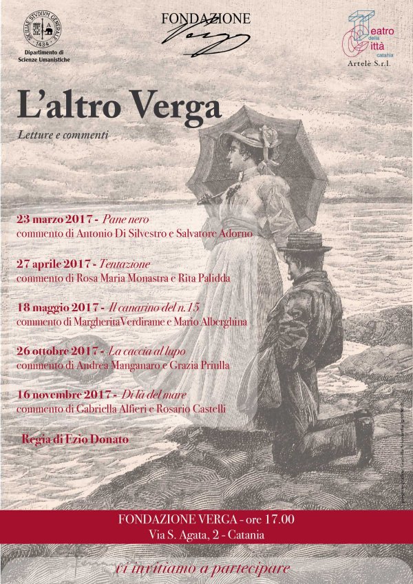Giovedì 18 maggio alle 17, nella sede della Fondazione Verga (via Sant' Agata 2, Catania), terzo appuntamento del ciclo per voci recitanti e musica "L'altro Verga - Letture e commenti", organizzato in collaborazione con il dipartimento di Scienze umanistiche. Le letture, coordinate dal regista Ezio Donato, saranno arricchite dal commento di studiosi di vari ambiti disciplinari: italianisti, linguisti, filologi, medici e sociologi.