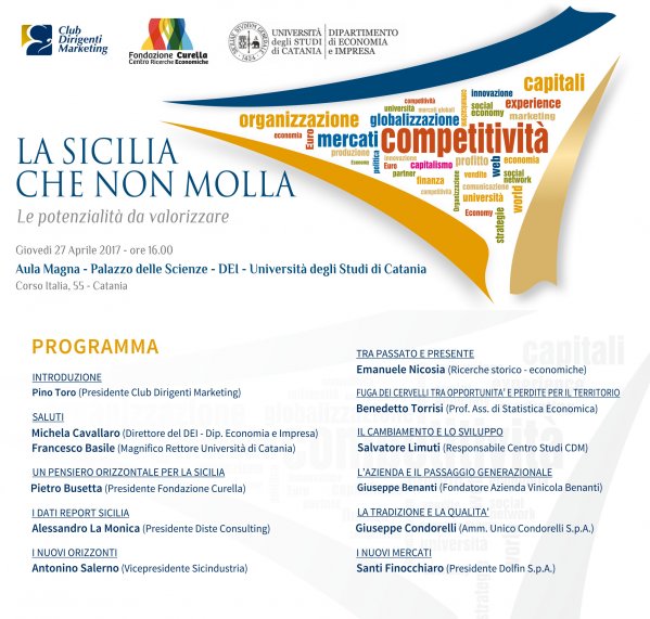 Giovedì 27 aprile alle 16, nell'aula magna del Palazzo delle Scienze (dipartimento di Economia e Impresa, corso Italia 55, Catania), si svolge il convegno "La Sicilia che non molla - Le potenzialità da valorizzare", organizzato dal Club Dirigenti Marketing, in collaborazione con il dipartimento Economia e Impresa dell'Università di Catania e la Fondazione Curella.